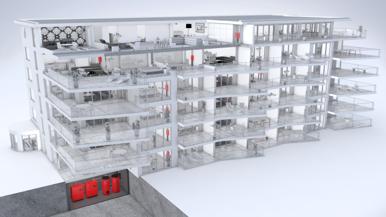Für Investoren, die der Umwelt – und dem Komfort in den Wohnungen – erste Priorität einräumen wollen, ist dieses System das passende. Die beiden Wärmepumpen Thermalia dual finden hier zum effizienten und zugleich klimaschonenden System zusammen, ergänzt mit dem fixfertigen, installationsbereiten Heizungsverteiler TransShare. Komfortlüftungsgeräte HomeVent machen die zukunftsgerichtete Lösung perfekt. Kontrollierte Wohnraumlüftung dient allen: Die Bewohnerinnen und Bewohner haben stets saubere Luft, und der Investor kann damit den Wert der Gebäudesubstanz erhalten. Eine saubere Gesamtlösung – in jeder Hinsicht.