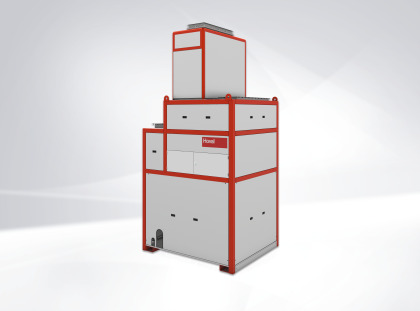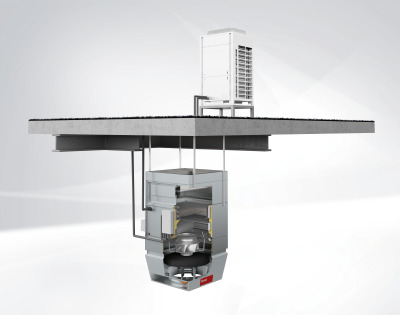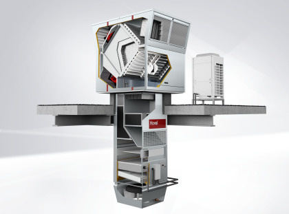 Es besteht aus einzelnen Modulen, die je nach Anforderung miteinander kombiniert werden. Die einzelnen Geräte sind über den Raum verteilt an der Decke oder im Dach installiert und leiten von dort die Luft gezielt nach unten. Der Raum wird so gleichmässig temperiert, wodurch sich auch der Wärmeverlust durch das Dach entscheidend verringert.