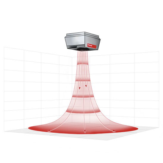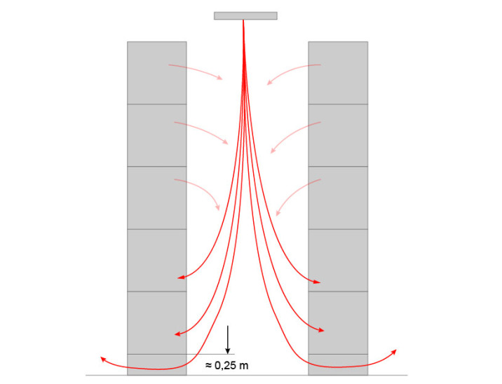In heating mode, a highly concentrated air stream is emitted at high speed from the distributor and a negative pressure difference occurs around the air column (Bernoulli distribution). As a result, the ambient air moves from the ceiling area and, to a lesser extent, from the top shelves towards the air stream. As the depth of penetration increases, the air stream slows down, the surrounding negative pressure decreases and the ambient air is induced. The flow then reaches the bottom shelves.