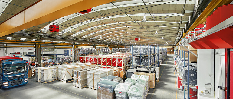 The supply of heating and cooling media can be centralised or decentralised for recirculated and outdoor air units. As far as logistics halls are concerned, decentralised solutions are the best option. Their implementation with recirculated and/or outdoor air units, equipped with reversible heat pumps, is a lot less costly than a centralised supply consisting of a boiler system, water chiller and the associated hydraulic system. As decentralised systems do not require heating rooms, valuable storage space is also preserved. A further advantage of decentralised heating and ventilation systems is that, from a structural point of view, individual smaller point loads are easier to integrate into a hall structure than large individual loads.