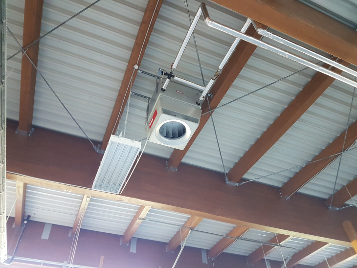 Inside the Pannonian wood competence centre, there are two TopVent recirculation air units mounted on the ceiling.